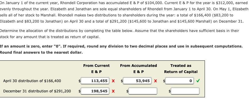 Elizabeth and Jonathan are sole equal shareholders of Rhondell from January 1 to April 30. Rhondell makes two distributions to. On January 1 of the current year Rhondell Corporation holds accumulated E P of 13000.